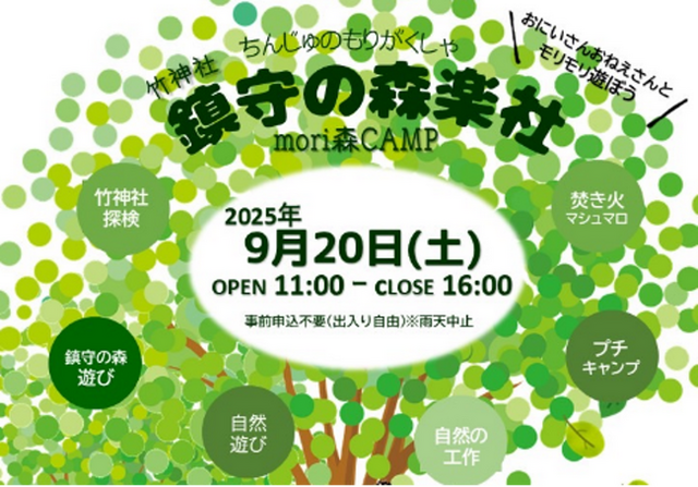 明和町の観光地域づくりを推進する一般社団法人明和観光商社(本社:三重県多気郡明和町、以下明和観光商社)は、地域住民とともに活性化に取り組む竹神社にて、9月20日(土)、子どもたちのための自然体験イベント「鎮守の森楽社 - mori森CAMP」を実施します。当日は、竹神社の鎮守の森を開放し、皇學館大学の学生・卒業生たちとともに、自然の中で遊び・学び・交流できる場を設けます。今後も地域コミュニティ主体で、自然や文化資源を活かした観光まちづくりを進めてまいります。