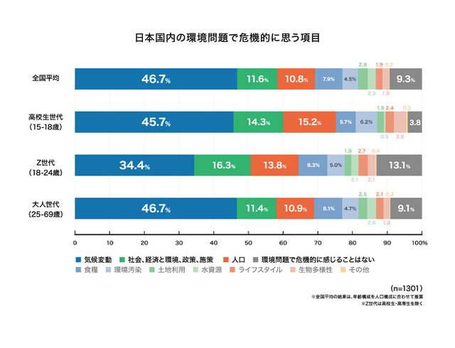 一方で、「環境問題で危機的に感じることはない」と解答した割合が最も高かったのはZ世代で13.1%、次いで大人世代が9.1%、高校生世代は3.8%でした。今回初めて調査対象へ追加した高校生世代では、2022年度から高校で必修科目となった「総合的な探究の時間」を通じて環境問題に触れる機会が多く、その結果、環境への危機意識が高まっている可能性が伺えます。