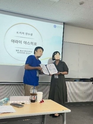 研修期間中、日本における韓国語教育の現状について報告を行い、各国から集まった参加者と意見を交わしました。発表において、日本国内における学習者数の動向や学習目的の多様化、大学における韓国語教育の位置づけなどについて紹介したことで、他国における教育事情と比較した議論を深めるきっかけとなりました。また、本学外国語学部の韓国語教育についても紹介し、各国の先生方に関心を持っていただきました。ほかにも講義や模擬授業を通じて、外国語習得理論、AI・デジタル技術を活用した教授法、韓国語教師に求められる役割や資質などについて学びを深められただけでなく、文化体験や座談会を通じて多文化理解と国際的ネットワークの構築が進み、国境を越えた教育者同士のつながりが生まれ、韓国語を通じて世界に広がる実感を得ました。今回の研修を通じて得た知見や国際的視点は、今後、本学における韓国語教育のさらなる質的向上に活かしていきます。