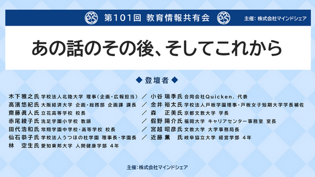 株式会社マインドシェア(本社:東京都、代表取締役:今井 祥雅)は、2025年9月19日(金)に「第101回 教育情報共有会」を開催いたします。本会は、2021年4月よりスタートし、教育機関や教育関係者を対象に、知見や実践の共有を目的として継続してきたオンラインイベントです。