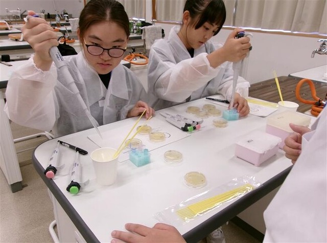 遺伝子組み換え実験を体験する中学生