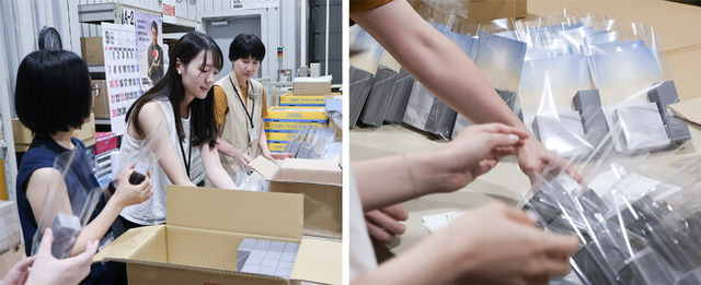 オルビス東日本流通センターにて、スキンケアセットの梱包作業を行う様子