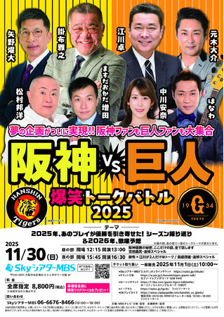 11月30日(日)に大阪・SkyシアターMBSにて、阪神・巨人のレジェンド選手、そして両球団の熱狂的なファンであるタレントが応援団として参加し、プロ野球愛を語り合う『阪神VS巨人 爆笑トークバトル2025』の開催が決定しました。阪神タイガースがリーグ優勝を果たした今年、大阪の地で夢の企画がついに実現します。