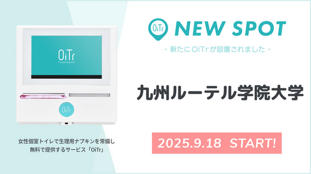 全国の商業施設や交通機関、公共施設、オフィス、学校などの女性個室トイレに、生理用ナプキンを常備・無料提供する日本初のサービス「OiTr(オイテル)」を展開するオイテル株式会社(本社:東京都新宿区、代表取締役:崎山 真)は、「トイレットペーパーのように、個室トイレに生理用品が行き届く社会」の実現を目指し、新たに「九州ルーテル学院大学(熊本県熊本市)」にOiTrを設置し、2025年9月18日よりサービスを開始しましたことをお知らせいたします。なお、今回が熊本県内で初のOiTr設置事例となります。