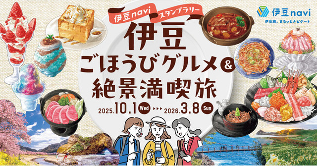 伊豆急行株式会社(本社:静岡県伊東市、社長:土方 健司)は、東日本旅客鉄道株式会社(本社:東京都渋谷区、社長:喜㔟 陽一)、東急株式会社(本社:東京都渋谷区、社長:堀江 正博)、伊豆急行株式会社が運営するデジタルサービス「伊豆navi」との共催により、「伊豆naviスタンプラリー 伊豆ごほうびグルメ&絶景満喫旅」を実施いたします。