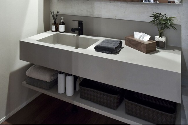 左官職人が一つ一つ手作業で塗り上げる造作洗面台です。素材にこだわり、左官材は、イタリアで開発された優れた性質を持つ新素材の「オルトレマテリア」を採用しました。コンクリートのようなシンプルかつスタイリッシュな仕上げで、全て職人の手作業で行われるため、ハンドメイドの美しさが際立ちます。