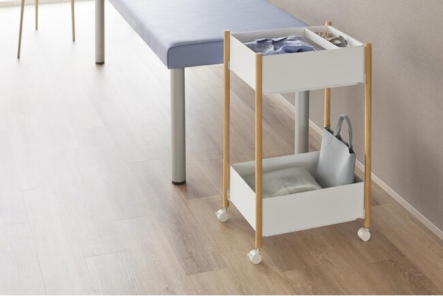さらに、取り外してそのまま持ち運べるバスケットや、移動をラクにするキャスター付きで使い勝手も抜群。木の質感を取り入れた上品なデザインは、空間に温かみを添え、病院やエステサロンなど幅広いシーンに自然に馴染みます。
