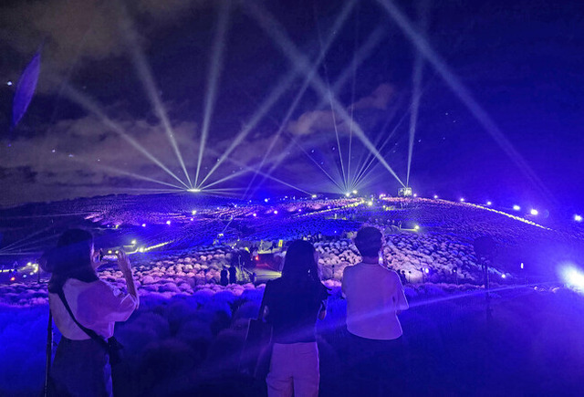 メイン会場「みはらしの丘」には、LEDライト358台とムービングライト34台を導入し、昨年よりも合計で23台増えています。約4万本のコキアが煌めき、壮大な美しさを見せます。ボリュームアップしたムービングライトが夜空に光を放ち、これまでにない迫力を体感いただけます。