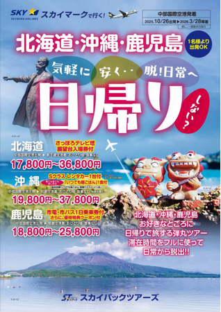 スカイパックツアーズ株式会社(本社:東京都中央区、社長:横山正巳)は、スカイマークを利用した価格固定型のパンフレット旅行商品「スカイステイションSpecial 日帰り弾丸ツアー」【中部国際空港発着】(2025年10月26日出発~2026年3月28日帰着)の販売を開始します。
