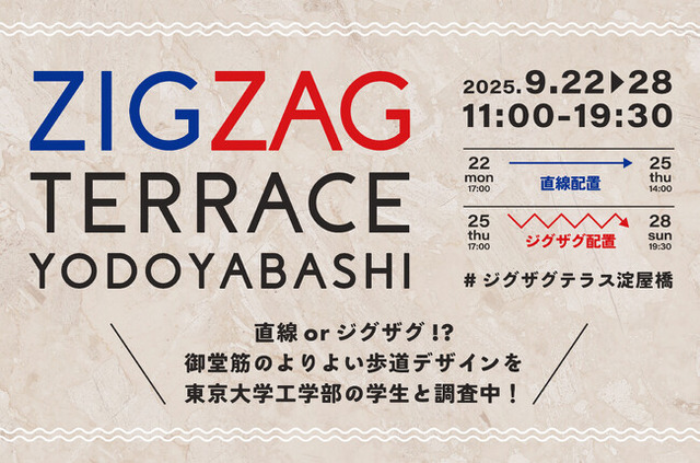 東京大学工学部都市工学科の4年生が中心になって企画した滞在空間配置の社会実験「ジグザグテラス淀屋橋」が、大阪・御堂筋の歩道上で実施される。場所は今年6月に開業した淀屋橋駅直結の最新複合施設「淀屋橋ステーションワン」前の歩道。期間は9月22日(月)から同28日(日)までを予定している。