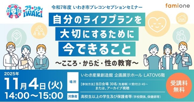 「子どもを願うすべての人によりそい 幸せな人生を歩める社会をつくる」をビジョンに掲げ、法人の従業員向け福利厚生や自治体の住民向け支援を行うヘルスケアサポートサービス「ファミワン」 https://famione.com/benefit/などを展開する株式会社ファミワン(本社:東京都渋谷区、代表取締役:石川勇介)は、福島県いわき市(市長:内田 広之、以下 いわき市)より委託を受け、2025年11月4日(火)にオンラインセミナー「令和7年度 いわき市プレコンセプションセミナー 自分のライフプランを大切にするために今できること~こころ・からだ・性の教育~」を開催します。