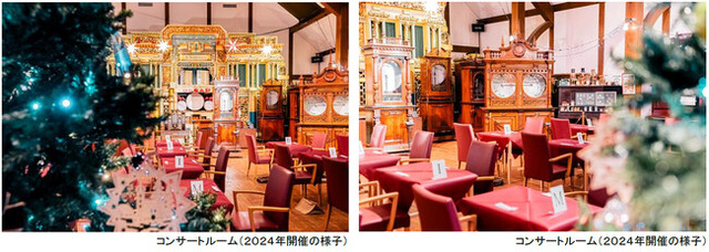 下記の日程で、夜のクリスマスイベントとして「森の音クリスマス・ナイト・コンサート2025」を開催します。当施設ならではの自動演奏楽器によるクリスマスコンサートを、併設の「森のCafe(※1)」特製クリスマスディナーと共に楽しめます。コンサート内では、演奏曲のリクエスト(1組1曲)ができるほか、特典として併設の「ミュージアムショップ時音」で使えるクーポンもご用意しています。