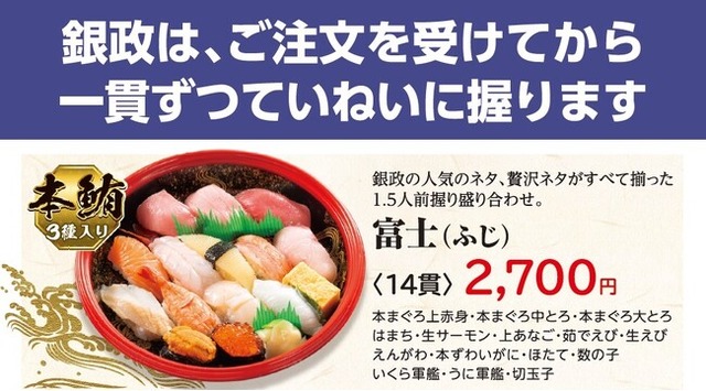 銀政自慢の豊洲直送本まぐろなど贅沢ネタから、はまち・サーモン・あなご・いくら・玉子焼きといった人気ネタまで、味・彩り・ボリュームのバランスにこだわりぬいたラインナップとなっており、ご自宅でのおもてなしや職場での会食など、さまざまな場面で活躍します。