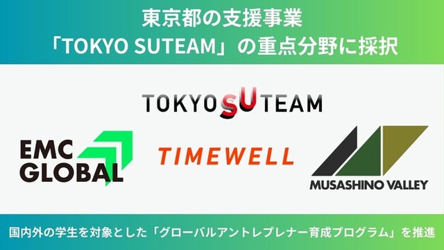 株式会社TIMEWELL(本社:神奈川県横浜市、代表取締役:濱本隆太、以下「TIMEWELL」)の代表濱本が理事を務める一般社団法人EMC GLOBAL(所在地:東京都三鷹市、代表理事:伊藤羊一)は、このたび東京都の多様な主体によるスタートアップ支援展開事業「TOKYO SUTEAM」に採択されました。本事業を通じて、国内外の学生を対象にしたグローバルアントレプレナー育成プログラムを推進し、日本から世界に挑戦する次世代起業家の排出を目指します。TIMEWELLとして、学生の事業アイデア創出、プロトタイプの作成支援、メンタリング等による事業化加速の支援をしていきます。