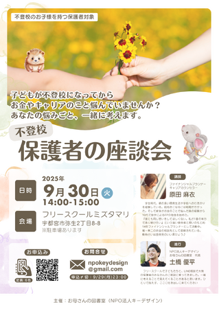 NPO法人キーデザイン(栃木県)は、2025年9月にスタートした新拠点「お母さんの図書室」にて、第1弾の講座企画として不登校の子をもつ保護者向け座談会「お金とキャリアの悩み、一緒に考えます」を2025年9月30日(火)14:00~15:00に開催します。会場はフリースクールミズタマリ2階「お母さんの図書室」(宇都宮市弥生2丁目8-8)、参加費無料・定員6名(要申込/締切9月29日[月]23:00)です。ゲストにファイナンシャルプランナーの原田麻衣さんを招き、家計や働き方の不安について、少人数で安心して話せる時間を提供します。