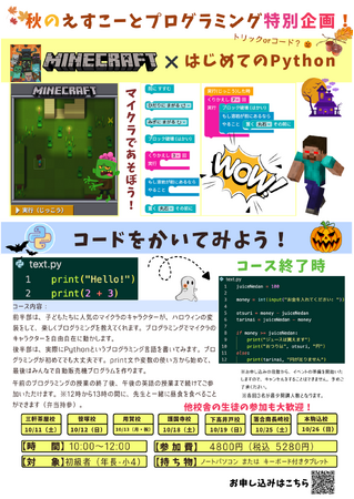 前半は、子どもたちに人気の「マインクラフト」のキャラクターがハロウィン仕様に変身!キャラクターを動かしながら、楽しんでプログラミングに挑戦します。後半は、実際にPython言語を使い、print文や変数の基礎を学び、最後はみんなで「自動販売機プログラム」を作成します。