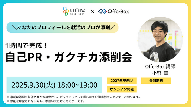 学生と企業をつなげる新卒オファー型就活サービス「OfferBox(オファーボックス)」を運営する株式会社i-plug(本社:大阪市淀川区、代表取締役 CEO:中野智哉)は、2027年卒業予定学生(以下、「27卒採用」)向けの就活セミナーを開催します。当セミナーは全国大学生活協同組合連合会(以下、大学生協)とコラボ企画です。9月30日(火)にオンラインにて開催予定です。
