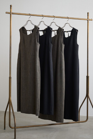 ・計算されたネックライン: ジャンパースカートのネックラインと肩のラインに合うように、絶妙なカッティングにこだわりました。レイヤードした際に、首元をすっきりと美しく見せてくれます。