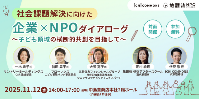 社会課題の解決に取り組む組織の共助共創を支援するICHI COMMONS株式会社(東京都千代田区、代表取締役:伏見崇宏)と「日本中の放課後を、ゴールデンタイムに。」をミッションに活動する特定非営利活動法人 放課後NPOアフタースクール(東京都文京区、代表理事:平岩国泰)は、11月12日(水)株式会社中島董商店 本社(東京都渋谷区)にて「社会課題解決に向けた企業×NPOダイアローグ~子ども領域の横断的共創を目指して~ 」と題したダイアローグを開催します。