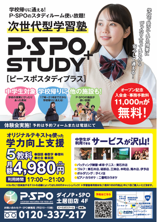 株式会社三福ホールディングス(本社:愛媛県松山市)が運営するP・SPO(ピースポ)は、2025年10月1日(水)より、中学生を対象とした新しい学習サービス**「P・SPO スタディ+(プラス)」**をダイノP・SPO土居田店4階に開校します。オリジナル教材と、P・SPOの多様な施設を組み合わせることで、「学校帰りにそのまま学習+他の様々な施設も利用可能」**という、次世代型の学習体験を提供します。