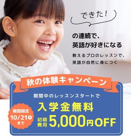 シェーン英会話では、2025年10月1日(水)から10月21日(火)まで、お得なキャンペーンを実施中です。期間中にシェーン英会話にご入学いただき、レッスンをスタートした方は、以下の特典が受けられます。【特典1.】