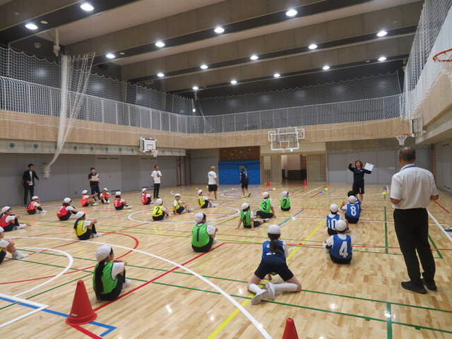 言葉を発せずに行うジェスチャーゲームでは、身振り手振りだけでは相手に自分の思いを伝えるのに苦労し、なかなか次の児童にジェスチャーが伝わらず恥ずかしがる児童もいてとても初々しい体験会になったと思います。ボールを使った色ドリブルやミニゲームでは、フットボールが得意な児童も多く、山本監督からは「魅せるねー」という賞賛の言葉が何度も飛び交いました。