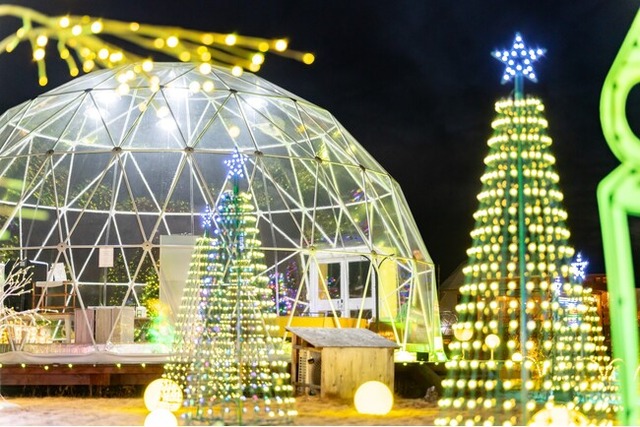 全6棟のドーム型グランピング施設「グランドーム滋賀高島」の広大なセンターガーデン内にて開催される、音と光のイルミネーションイベント。