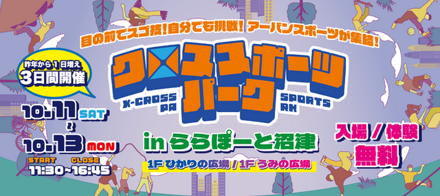 イベント名:クロススポーツパーク in ららぽーと沼津日程 :2025年10月11日(土)~13日(月・祝) 11:30~16:45