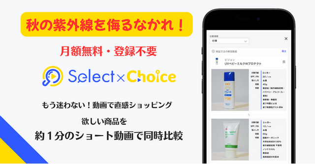 「夏が終わったから日焼け止めはもう不要」と思っていませんか?しかし、秋の紫外線も子どものデリケートな肌には大敵です。セレクトチョイスでは、秋でも紫外線対策が重要であるという事実に着目し、子ども用日焼け止めの検証コンテンツを拡充しました。日常生活において必要十分な成分を含んだ日焼け止めをメインに行った検証結果を公開します。今回の検証では、気になる紫外線カット率を可視化。動画だからこそリアルな紫外線カットの効果を見ながら、自身に最適な商品を、ご自宅でじっくりご確認いただけます。[画像2: https://prcdn.freetls.fastly.net/release_image/155932/8/155932-8-305f851aefaab464ca56dbba01f98142-1370x2700.png?width=536&quality=85%2C75&format=jpeg&auto=webp&fit=bounds&bg-color=fff ]