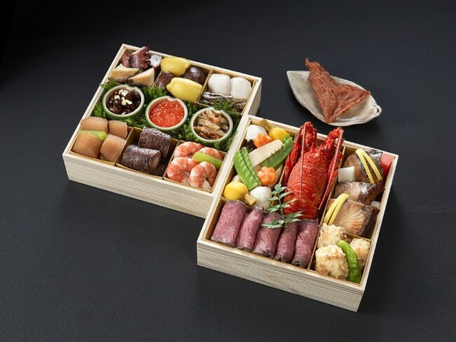 豊かな自然の恵みと日本料理の繊細な手法で丁寧に仕立て上げるグランドニッコー淡路のおせち。二段重の「特選 夢おせち」は兵庫県丹波産の黒豆蜜煮、数の子、田作りなどの祝い肴をはじめ、鮑の柔らか煮、鰆や鰤の焼き物、冬の味覚・淡路島3年とらふぐの濃厚な白子蒸しに国産イセエビなど贅を尽くした料理が美しく並びます。また、おせちに添えてご用意する高級珍味の干し子は日本酒で祝う宴の席にふさわしい逸品です。さらに本年は淡路牛を塩麴に漬け旨味を凝縮させた特製のローストビーフが新たに加わり、より一層豪華な内容でお楽しみいただけます。