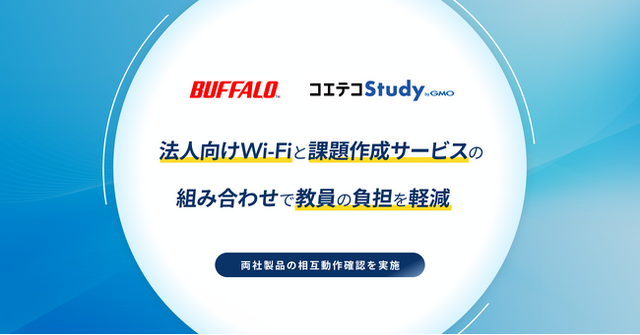 GMOインターネットグループのGMOメディア株式会社(本社:東京都渋谷区、代表取締役社長:森 輝幸、以下GMOメディア)と株式会社バッファロー(本社:東京都千代田区、代表取締役 社長執行役員CEO:牧 寛之、以下バッファロー)は、法人向けWi-Fiアクセスポイント「AirStation Proシリーズ」と高校教員向け課題作成サービス「コエテコStudy byGMO」との動作確認を行いました。両商品を組み合わせることで、教務DXを推進し、教員の作業負担を軽減します。