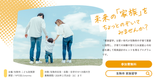 【対象者】生駒市内在住の18歳~39歳の方(未婚・既婚不問/生駒市内在学・在勤の方も可)【場所】生駒市内の受け入れ家庭宅