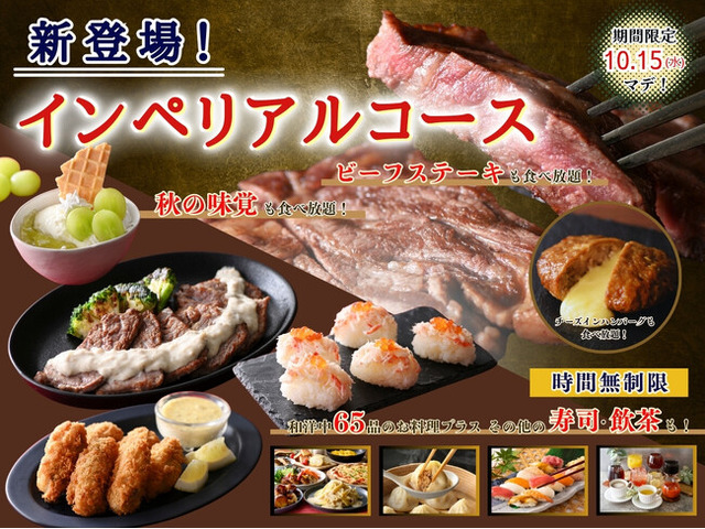 更に!+330円(税込)にて、肉の旨味を思う存分味わえる『ビーフステーキ』、ブレンドした濃厚な12種類のチーズが溢れる『チーズインハンバーグ』、更に!現在開催中の台湾グルメも満喫できる贅沢三昧な「インペリアルコース」が新登場いたします!