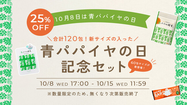 10月8日は日本青パパイヤ協会が制定した「青パパイヤの日」です。これを記念して、青パパイヤ酵素公式オンラインショップでは「青パパイヤの日記念セット」を販売します。セットには「青パパイヤ酵素 顆粒タイプ60包入り」が2袋含まれており、合計でたっぷり120包お届けいたします。