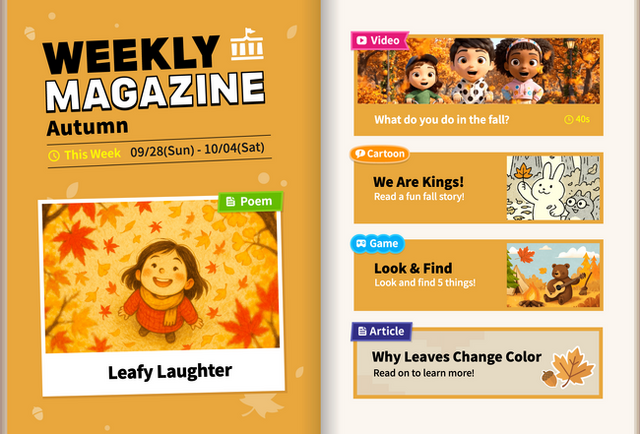 今回に提供する『Weekly Magazine』は、毎週新しいテーマを配信します。「科学」「スポーツ」「料理」「季節」などの子どもにとって身近なテーマを取り上げることによって、単なる英語学習にとどまらず、子どもの知的好奇心に寄り添いながら自然に英語を習得できるよう工夫しています。