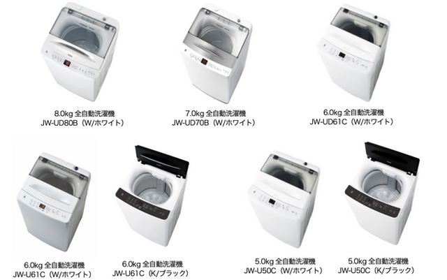 8.0kg 全自動洗濯機(JW-UD80B)・7.0kg 全自動洗濯機(JW-UD70B)・6.0kg 全自動洗濯機(JW-UD61C ・JW-U61C)・5.0kg 全自動洗濯機(JW-U50C)の概要は以下の通りです。