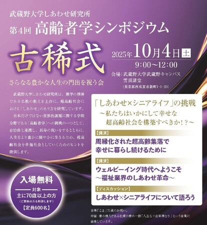 Musashino University Creating Happiness Incubation(武蔵野大学しあわせ研究所)は、2025年10月4日(土)に本学の武蔵野キャンパス(東京都西東京市)にて、主に70歳以上の方とその家族を対象に第4回古稀式を開催します。