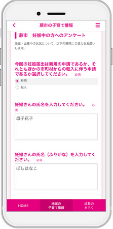 今回「伴走型相談支援サービス」の導入によって、母子手帳交付申請をはじめ、妊娠8か月時のアンケート提出や産後ケアの利用申請がアプリから可能となります。