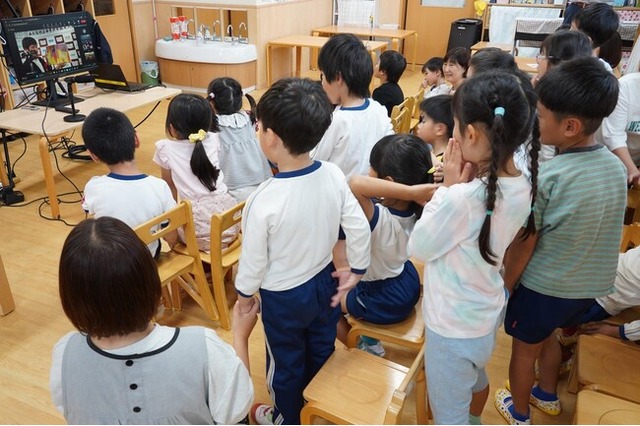 オンラインで授賞式(左奥の画面)を見守る、東大沢保育園の園児さんと保育士さん