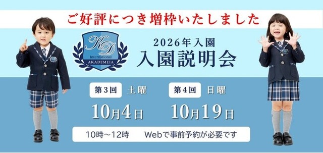 総合教育サービス企業の株式会社やる気スイッチグループ(東京・中央区、代表取締役社長:高橋 直司 以下、やる気スイッチグループ)は2026年4月1日開園予定のバイリンガル幼児園※1「キッズデュオインターナショナル(KDI: Kids Duo International)アカデメイア御成門」(東京・港区)は入園希望者向け説明会の参加枠を追加することを発表しました。9月に実施した説明会は満席となり、多くの反響をいただいたことを受け、10月4日(土)・10月19日(日)の枠を拡大いたします。