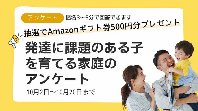 回答は選択式中心で3~5分。今回は特に、これまで声が届きにくかった父親の視点も集めたいと考えています。家庭内の双方の声がそろい、協力体制や子どもの発達を後押しするヒントがより豊かに集まると考えるため、パパママ誘いあってそれぞれ回答いただけると幸いです。