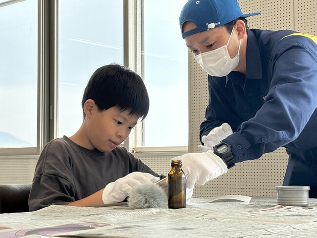一方、警察署では、指紋の採取に挑戦。手袋をつけて、息を凝らして、真剣に採取。一見何も見えないところから指紋が浮き上がる初めての体験。瓶から見事指紋を採取することができました。ある保護者が「本ではイメージ出来ないことも多く、実際に見て、手に触り、息子は大喜びでした」と語るように、テレビの向こう側だった世界に触れる“本物の警察体験”が、子どもたちの知的好奇心を強く揺さぶりました。
