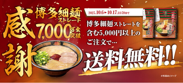 株式会社一蘭は、「一蘭ラーメン 博多細麺ストレート」の累計出荷数が7,000万食を突破したことを記念し、『「一蘭ラーメン 博多細麺ストレート」7,000万食突破!感謝祭』を期間限定で実施いたします。