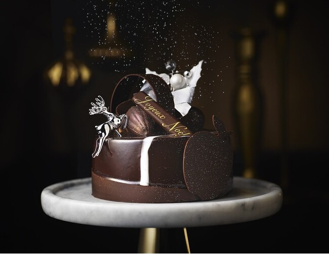 大きなチョコ飾り3色のカラーでクリスマスを表現。クリスマスマーケットを彩るオーナメントと満天の星空をイメージした、チョコレート飾りが印象的で、街中に漂うお菓子のスパイスの香りを、チョコレートムースに移したクローブやジュニパーベリーなどの香りで表現し、中にしのばせたベリーのコンフィの赤、バニラシャンティの白、ピスタチオクリームの緑で、クリスマスカラーを演出しました 。
