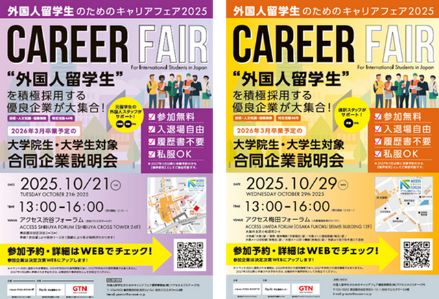 株式会社アクセスグループ・ホールディングス(東証スタンダード/福証本則・7042)の事業子会社で、人財ソリューション事業、教育機関支援事業を展開する株式会社アクセスネクステージ(本社:東京都渋谷区、代表取締役社長 増田智夫、以下「当社」)、株式会社学生情報センター(本社:京都府京都市、代表取締役社長 吉野一樹、以下、「ナジック」)、株式会社グローバルトラストネットワークス(東京都豊島区、代表取締役社長 後藤裕幸)の3社は、2025年10月21日(火)東京会場、10月29日(水)大阪会場にて、日本での就職を希望する外国人留学生を対象とした合同企業説明会「外国人留学生のためのキャリアフェア2025(以下、「本フェア」)」を共催いたします。