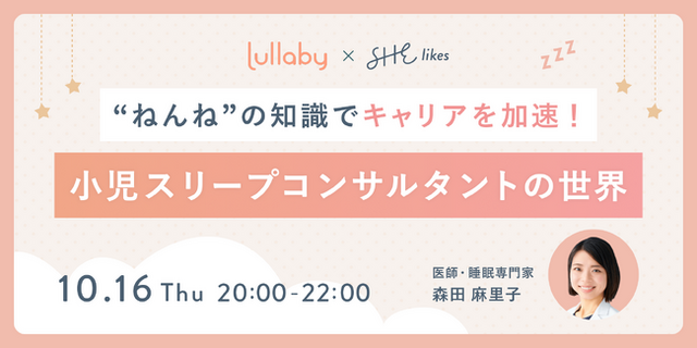 女性向けキャリアスクール「SHElikes(シーライクス)」を運営するSHE株式会社(所在地:東京都港区、代表取締役:福田恵里、以下SHE)は、夜泣き改善・寝かしつけサポートアプリ「ララバイ」を提供するLullaby株式会社(本社:東京都港区、代表取締役:田子友加里、以下「Lullaby」)と共同で、2025年10月16日(水)20時より、オンラインイベント「ねんねの知識でキャリアを加速!小児スリープコンサルタントの世界」を開催します。講師には、Lullabyの監修医であり睡眠専門家の森田麻里子先生をお招きし、科学的根拠に基づく育児知識とキャリアの可能性を広げる新しい学びを提供します。
