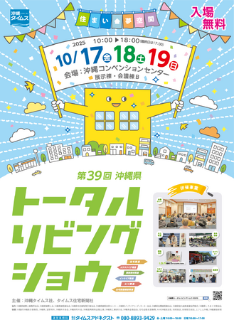 沖縄タイムス社(那覇市・瑞慶山秀彦社長)とタイムス住宅新聞社(那覇市・宮城栄作社長)は、沖縄県内最大級の総合住宅展「第39回沖縄県トータルリビングショウ」を、2025年10月17日(金)から19日(日)までの3日間、宜野湾市の沖縄コンベンションセンター展示棟・会議棟Bにて開催いたします。開場時間は午前10時~午後6時まで(最終日19日のみ午後5時)。
