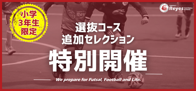 この度、東急Sレイエス フットボールスクール 池袋にて小学3年生を対象とした『選抜コース追加セレクション』開催の延長が決定いたしました。