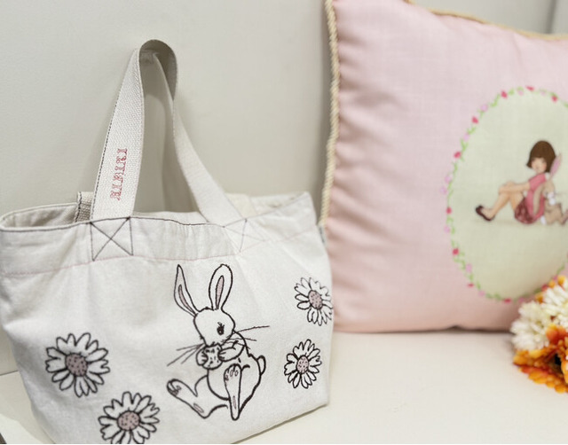 そんな絵本に描かれたノスタルジックでどこか懐かしい世界観がいっぱい詰まったイラストを刺繍仕上げしたトートバッグやマルシェバッグに、一つだけの特別なアイテムとなる名入れ刺繍を承ります。