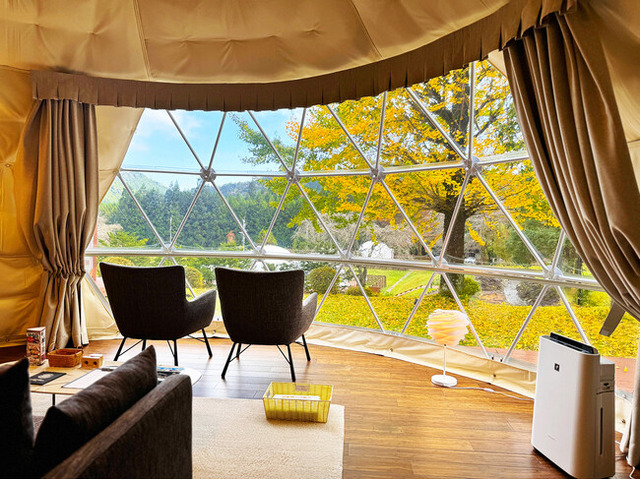 - テント内から紅葉を眺めながら、手ぶらで快適にアウトドアを満喫